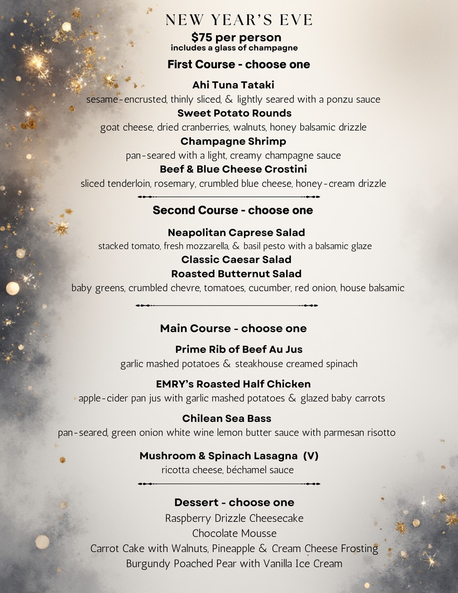 Ring in the New Year with us! ✨🖤 Join us for a special 3 course NYE dinner, complete with dessert & a glass of champagne - all for $75 per person! Reservations begin at 5pm. Cheers to 2025! 🥂🪩